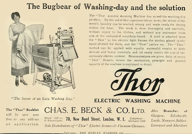 En 1908, Fisher patentó su invento bajo el nombre "Thor", en honor al dios nórdico del trueno, simbolizando la potencia de la electricidad. La máquina, fabricada por la Hurley Machine Company, era un coloso de hierro fundido y cobre: pesaba 150 kg, costaba 150 dólares (casi el salario mensual de un obrero) y requería instalación profesional. Pero tenía algo revolucionario: un motor eléctrico de 1/4 de caballo de fuerza, protegido por una carcasa a prueba de salpicaduras.